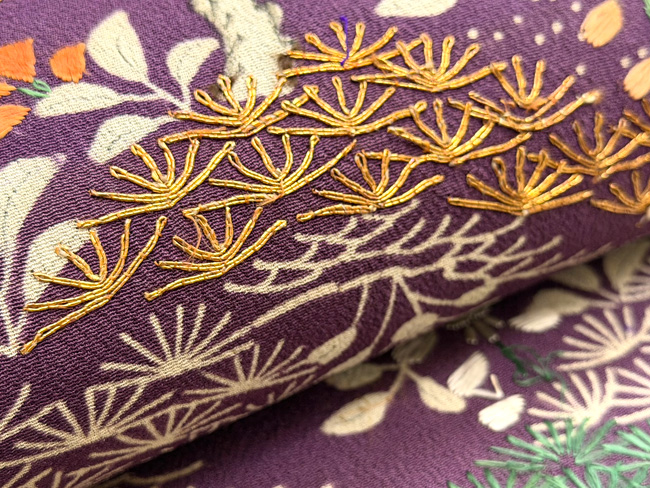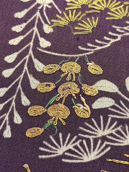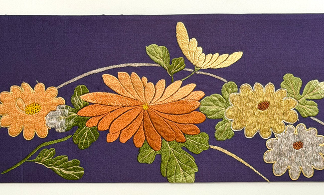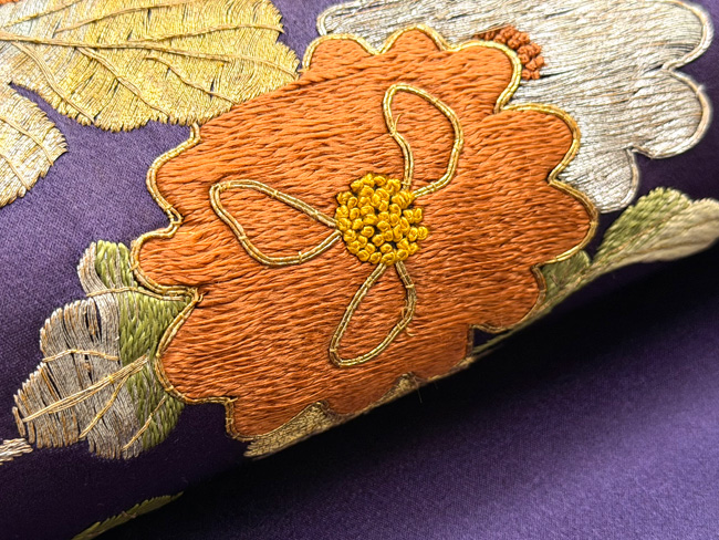 刺繍の黄・水色・生成り・臙脂、どれもお着物に合いやすい色目、秋におすすめの一本です。