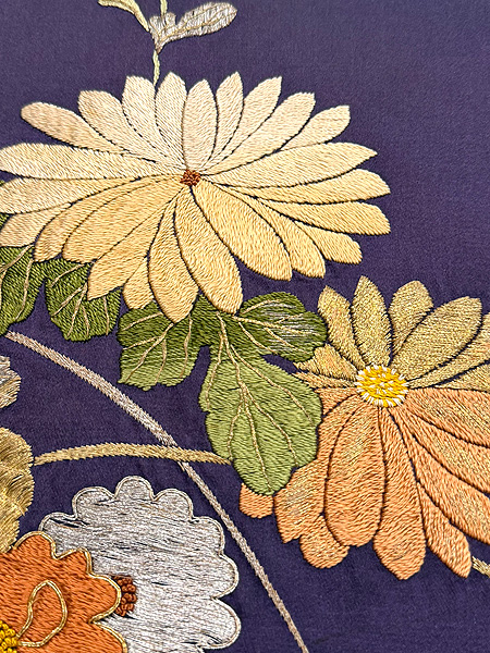深い紫紺の色に、大輪の菊がぼってりと刺されています。
