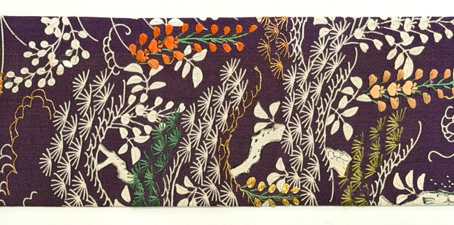 葡萄色に近い濃茶の塩瀬にカラフルな萩を刺繍したかわいい帯。
