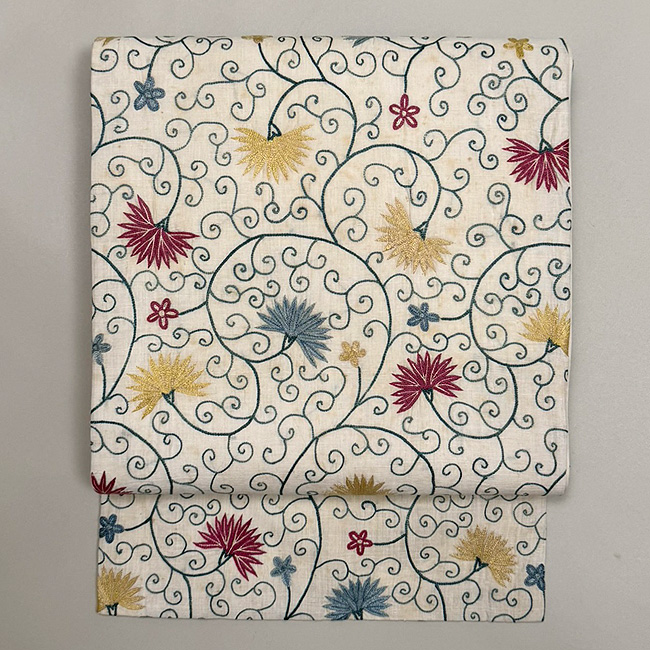 刺繍の花唐草の色合いは優しく、帯地は軽いです。
