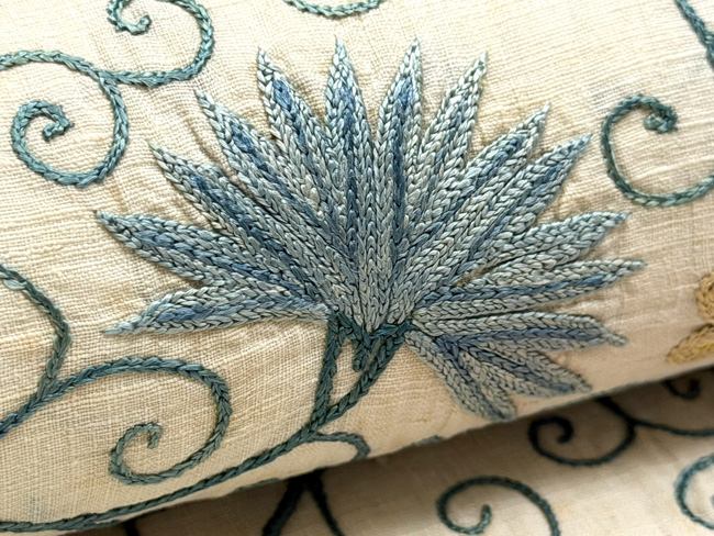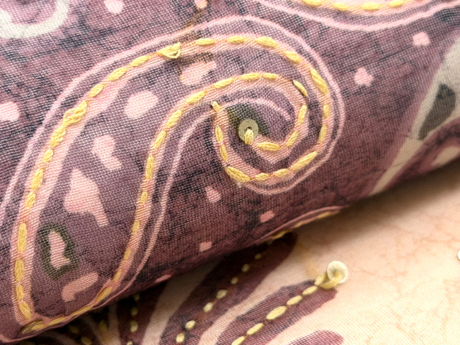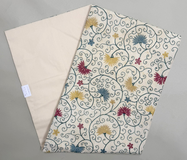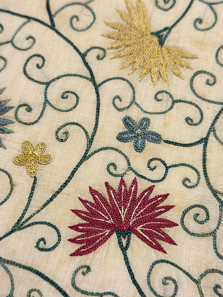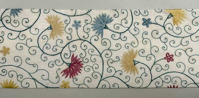 モスリンと呼ばれる薄手の木綿地に、絹糸でチェーンステッチの刺繍を施した布を帯にしました。
