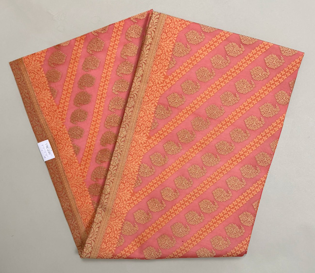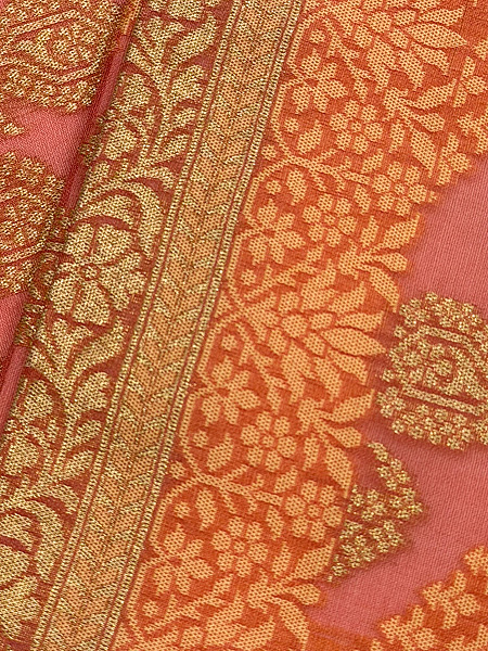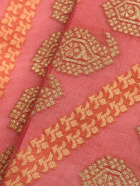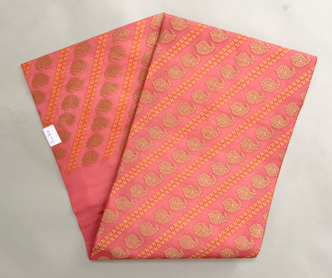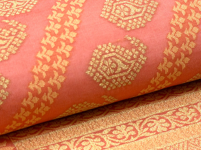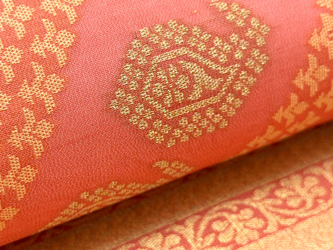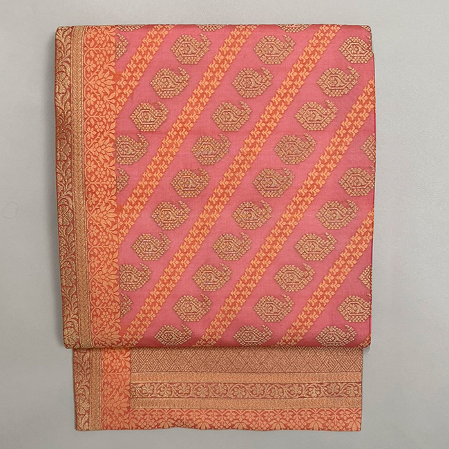 美しい桃色地に金糸とオレンジ色の糸を紋織したサリーを帯にしました。