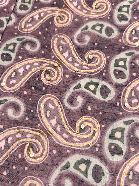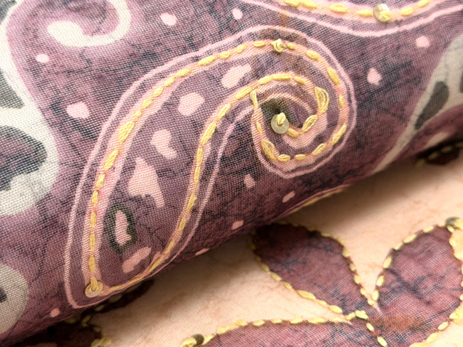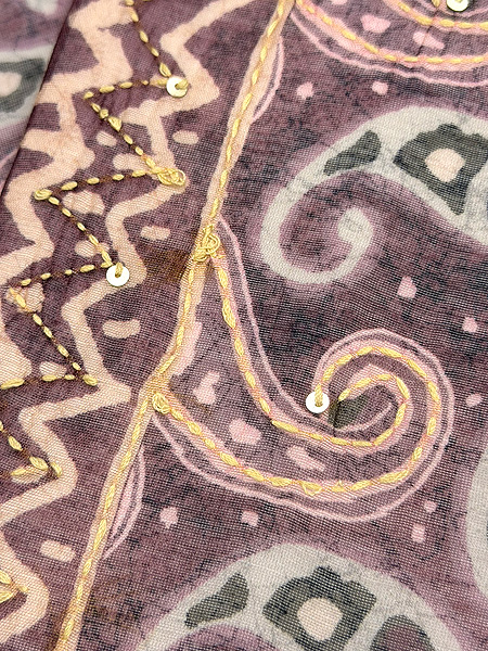 こちらはブロックプリントにカンタワーク、そしてスパンコールも施されたなかなか凝ったサリーを帯にしました。
