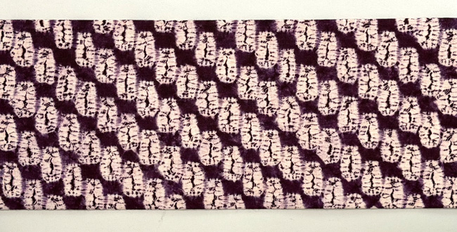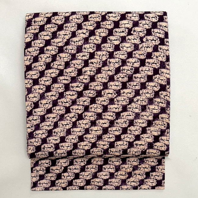 小さなお花の文様が染められた、民芸調の紫紺染めの名古屋帯です。
