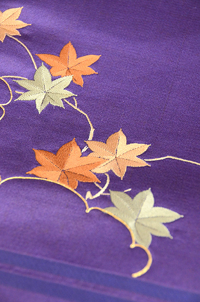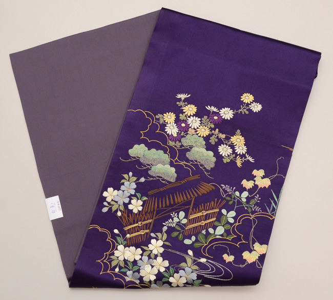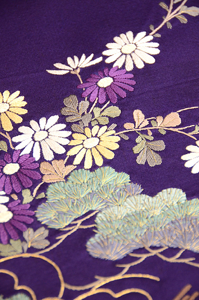 艶やかな瑠璃色の繻子地に、今、生まれ出たかのような瑞々しい刺繍が見事です。