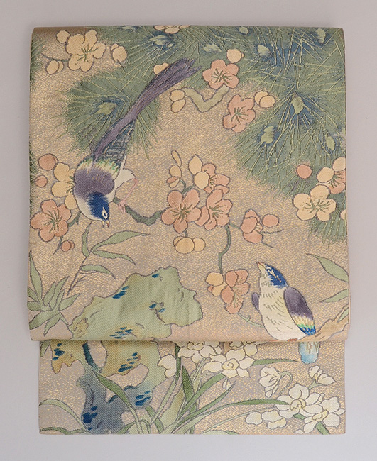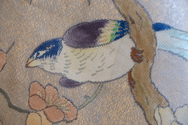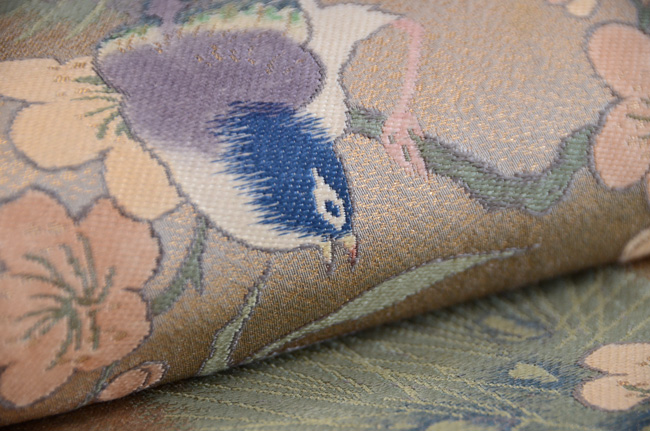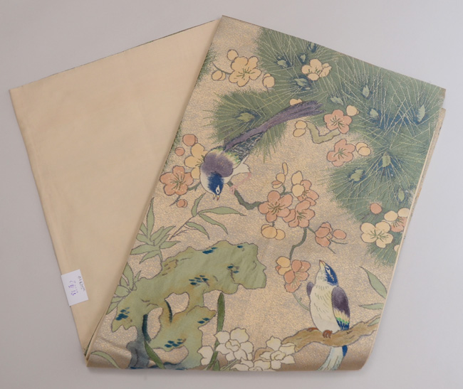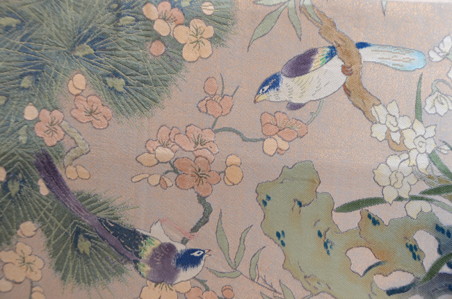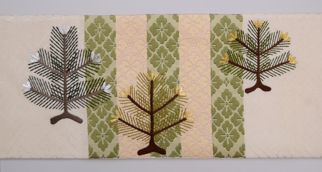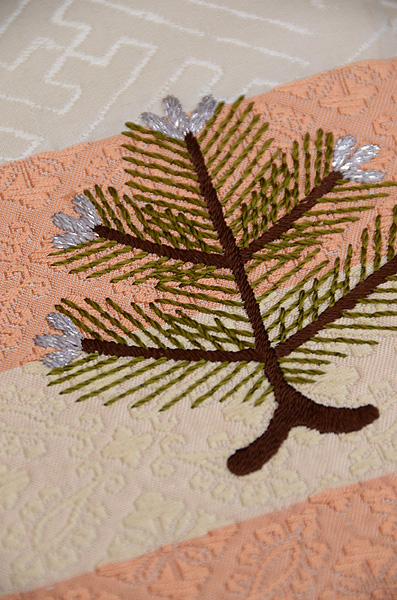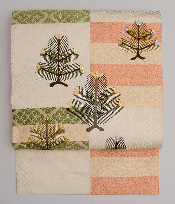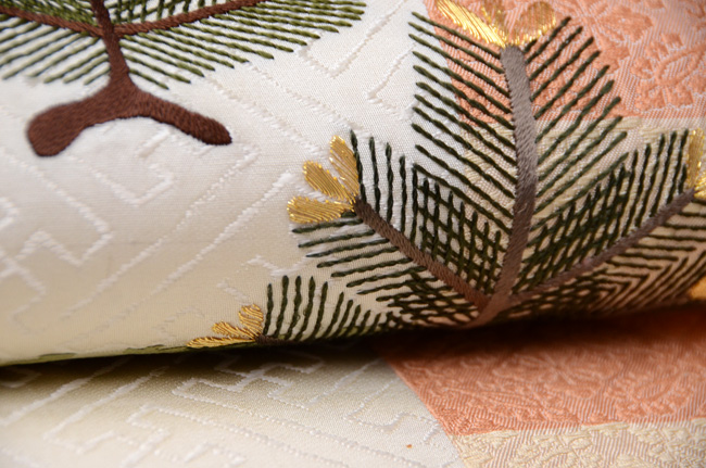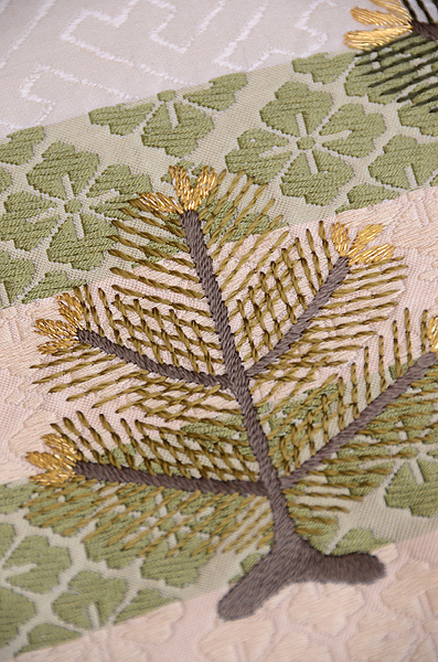 有職文が交互に織り込まれた上に、かわいくも凛々しい若松が刺繍されています。