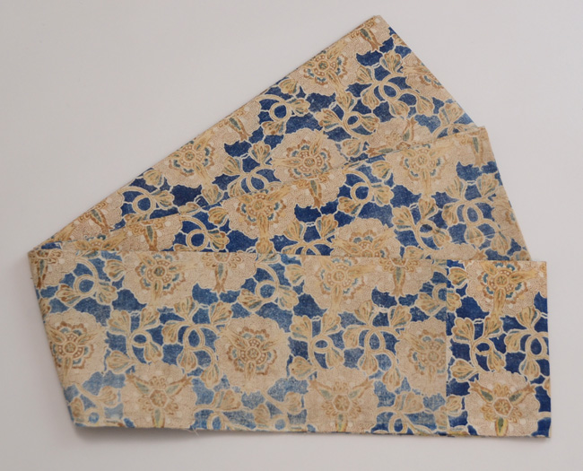 全く未使用の丸帯でしたが、お使いいただくにはと思い、名古屋帯に分けました。