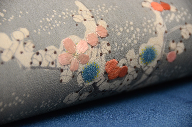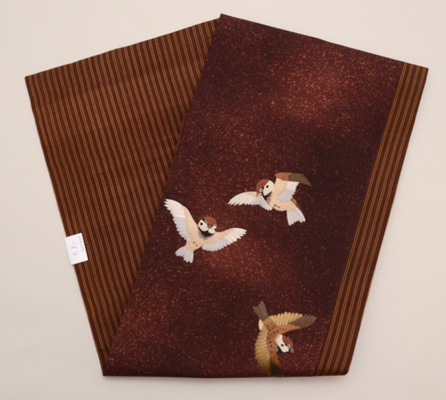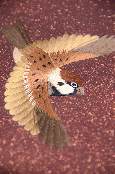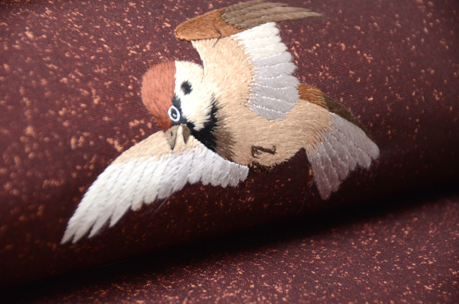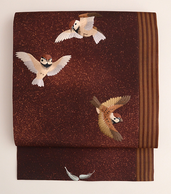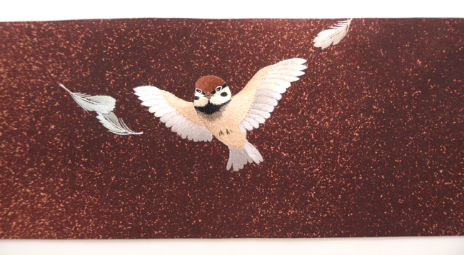 明るく生き生きとした雀達の表情が印象的な刺繍の名古屋帯です。