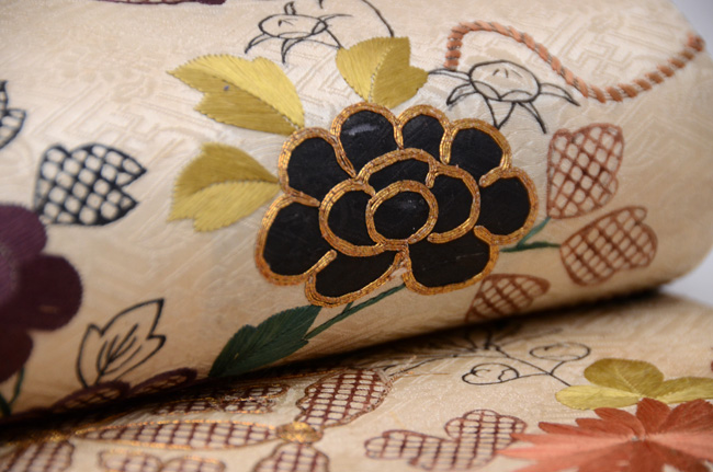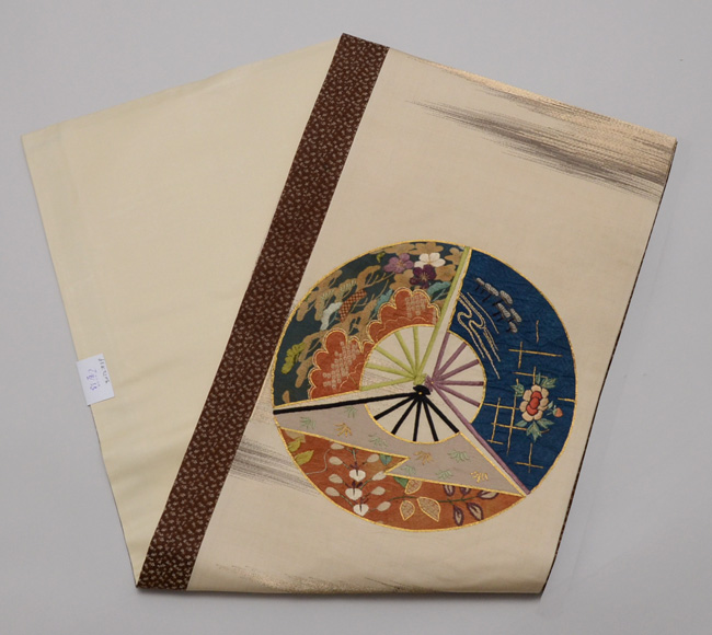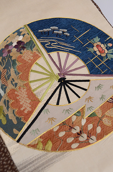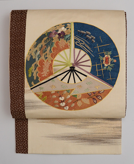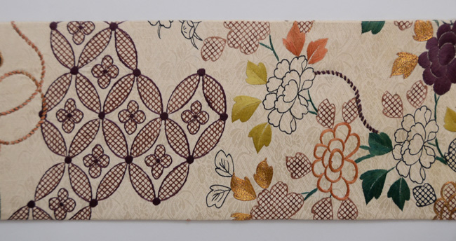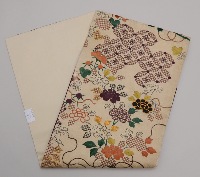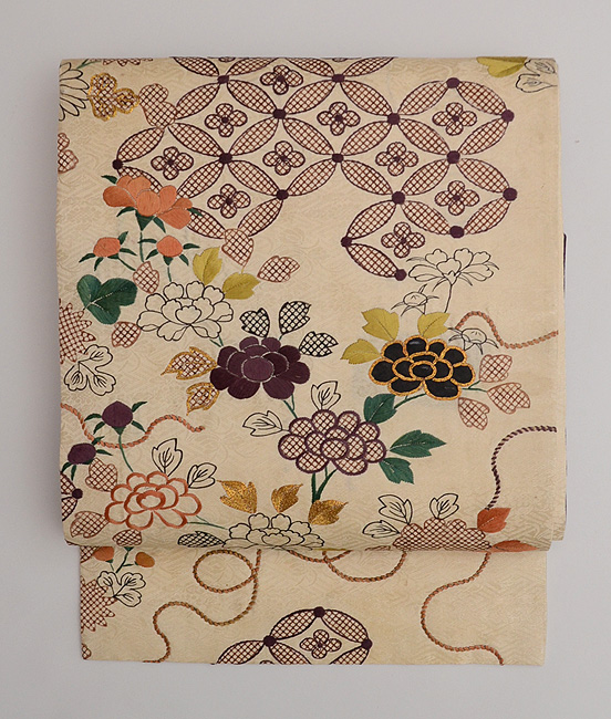 七宝という有職紋と四季の花々とを交互に配した、江戸後期の武家奥方の衣装を崩して帯にしました。