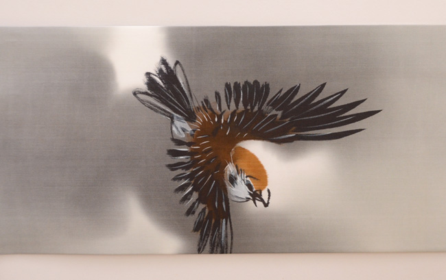 緞子織のようですが、ゆるぎのないしっかりとした帯地の迫力が、美しくもあり、それに負けないような鹿の姿を刺したつもりです。