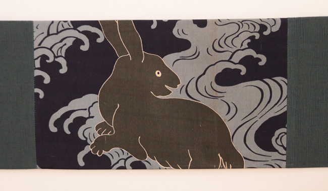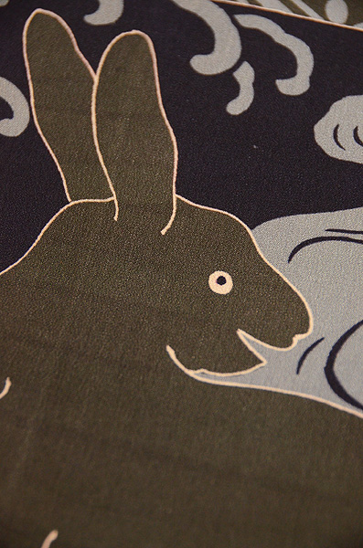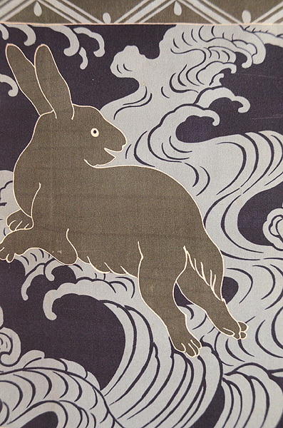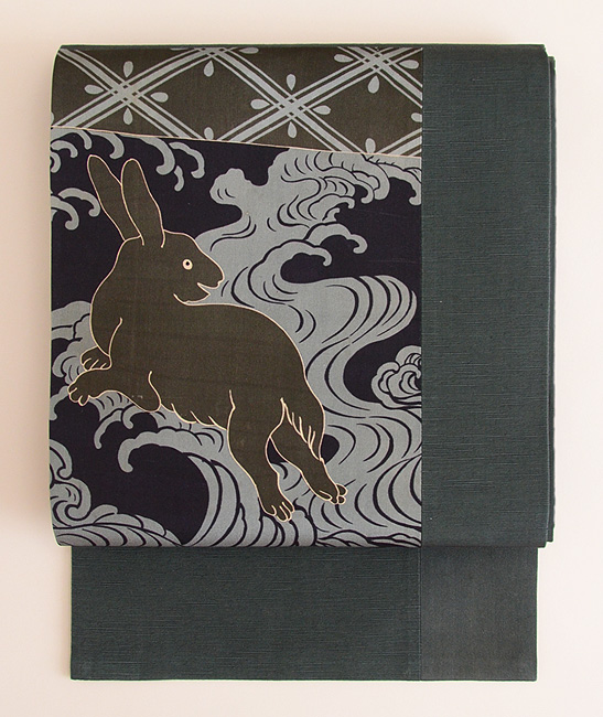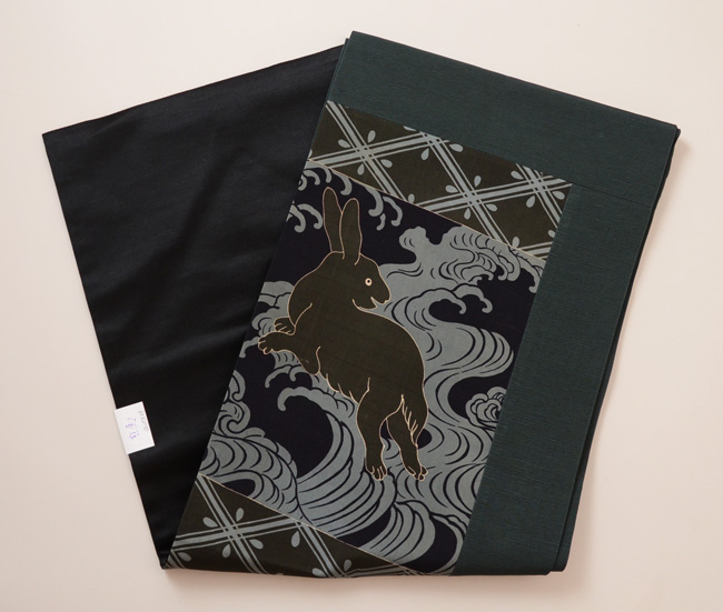 静かなデザインの波ウサギが、濃緑の布を得て、元気いっぱいに飛んでいる様子で、楽しい帯になりました。