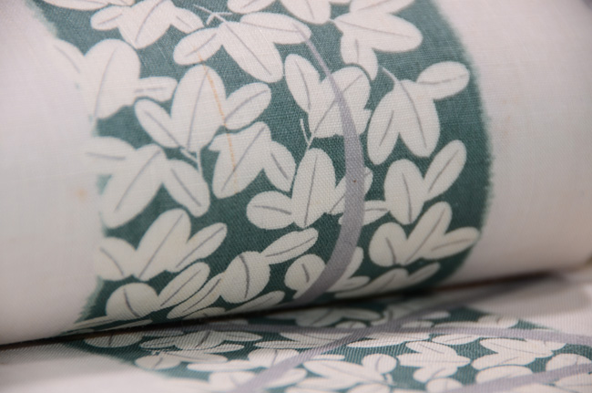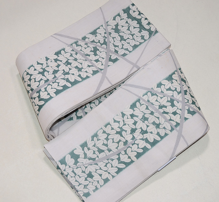 青色の葉っぱだけで覆われた、爽やかな名古屋帯です。