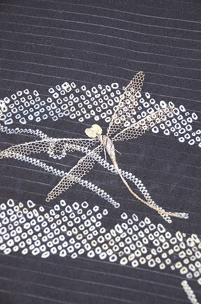 疋田絞りで大きな雪輪紋が、陰陽に染め分けられていて、良く見るとそれが野原の光景だったりもします。