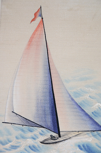 麻の地色に、赤い魚と墨の線の相性がうまくいきました。
