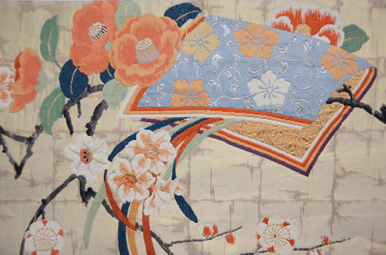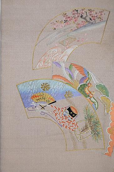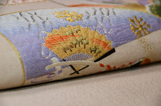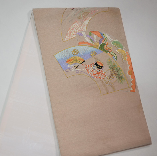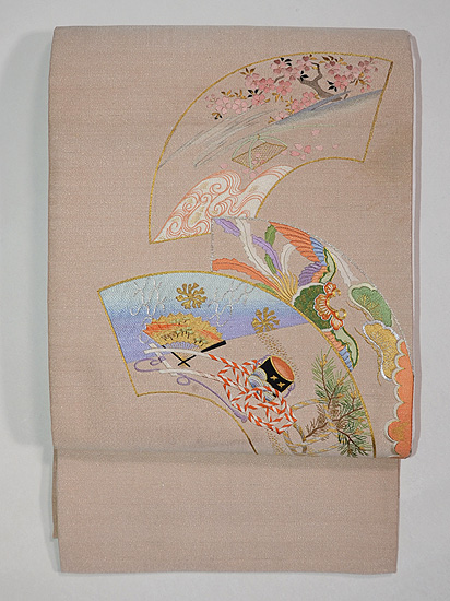 扇面には、お能の演目が刺繍された優雅で格調ある帯です。