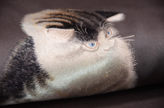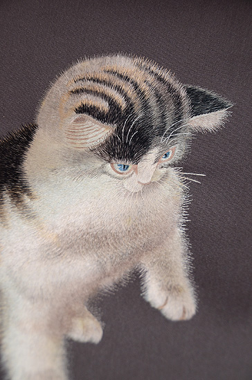 紋黄蝶に戯れる、かわいい猫ちゃんの様子が、巧みな刺繍で表現されています。