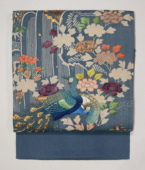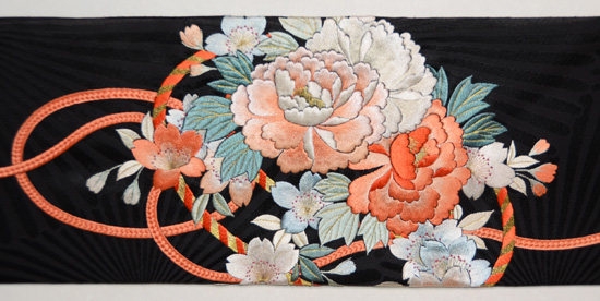 艶やかな緞子地に、牡丹の花びらの重厚な趣が溶け合って、豪奢な帯のお目見えです。