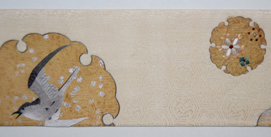 象牙色の繻子に、紅色の梅の大輪が照り映えて、新春讃歌を詠っているような名古屋帯です。