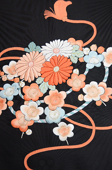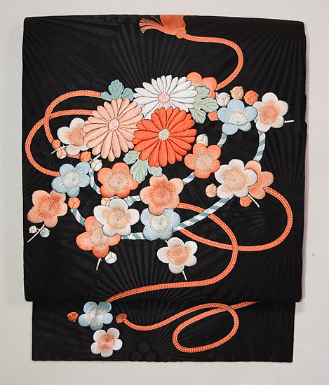 お太鼓に、梅と菊、前に牡丹と桜を配して、くす玉に見立てたおめでたい図柄です。