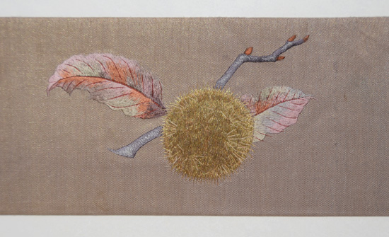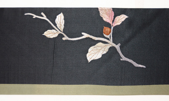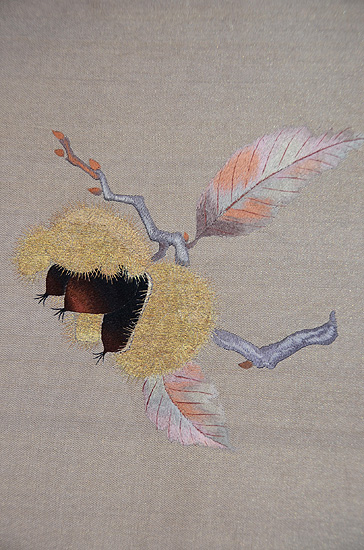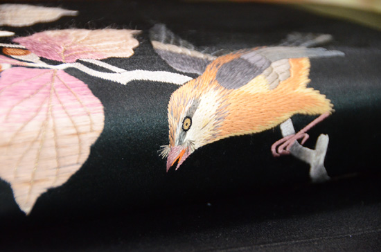 繊細な手刺繍、光沢をもつ絹糸が美しく立体感があります。