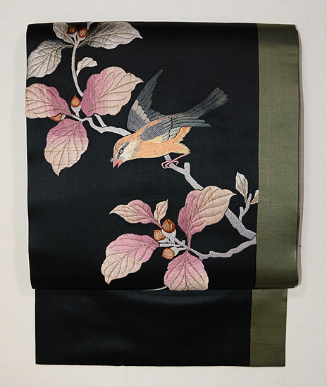 ドングリにヒヨドリの刺繍名古屋帯