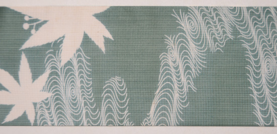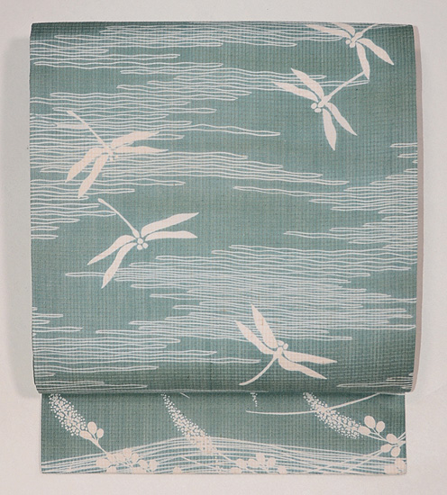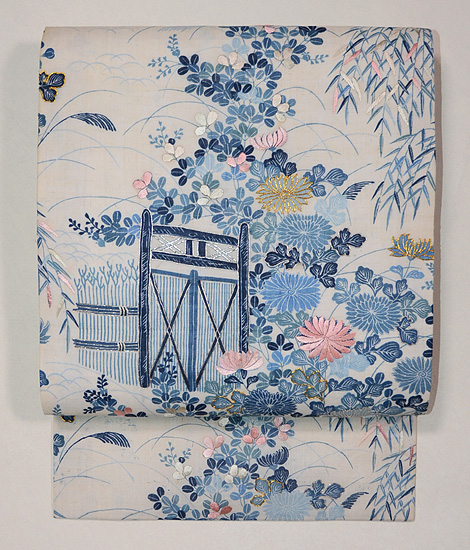 白い上布に藍のさわやかな色と糸目糊の繊細な描写が見事な帷子を名古屋帯にお仕立て直しました。