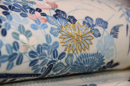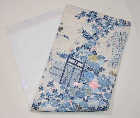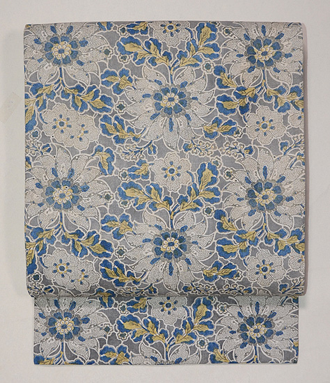 灰白色の時に藍の花文様が染められた古い堺更紗を名古屋帯に仕立てました。