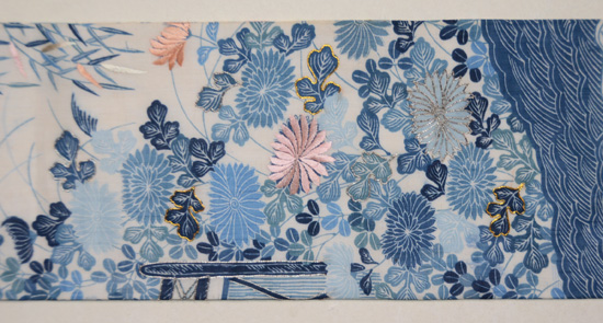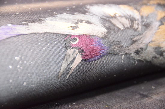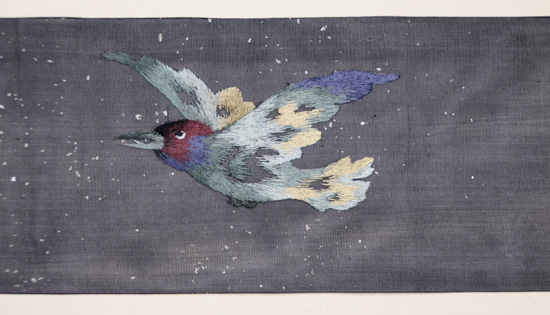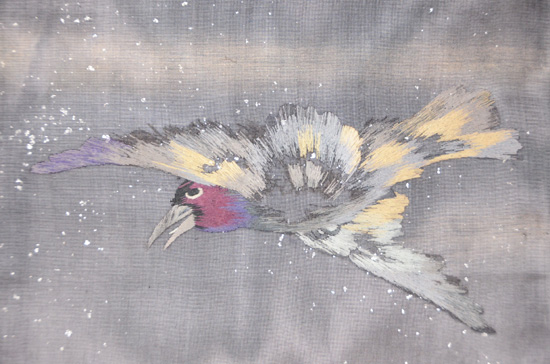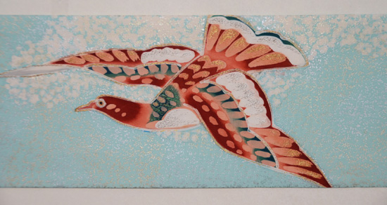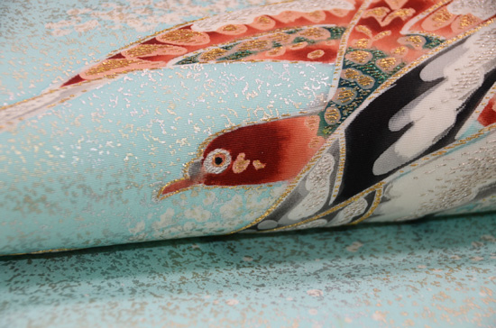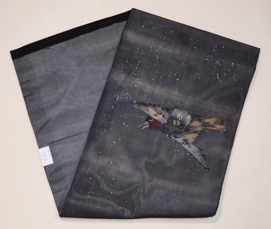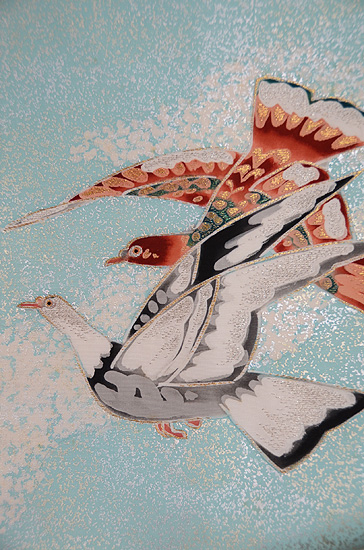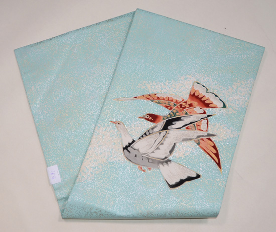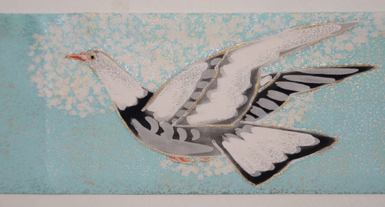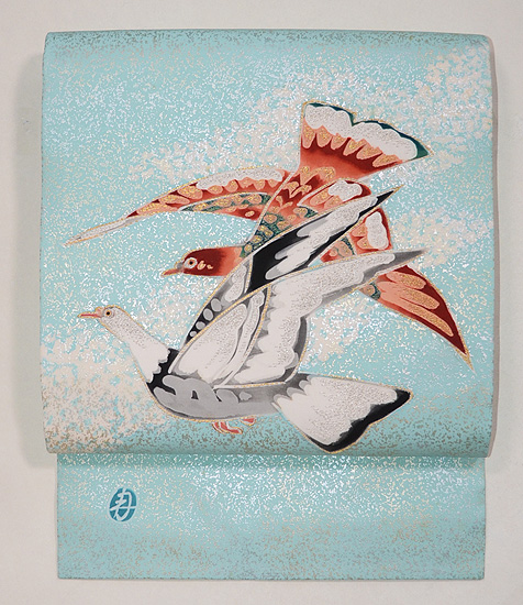 この帯は、白と銀2色のまき糊をしいた重厚さの光る洋画タッチの大空を2羽のハトが勢いよく飛翔しています。