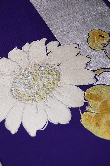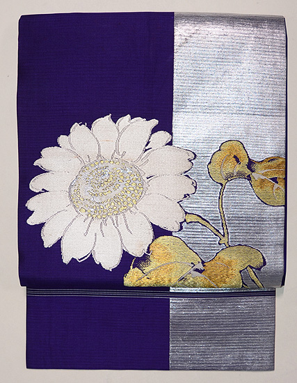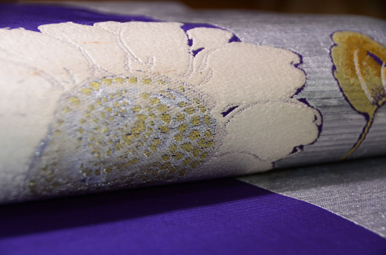 銀通しに透かしの入った横段に、思い切りの良い大輪のお花が咲き誇っています。