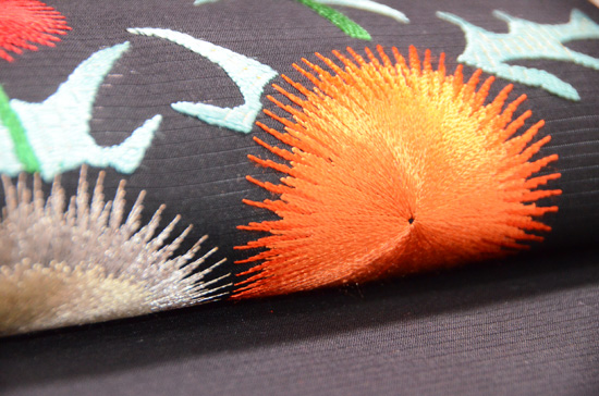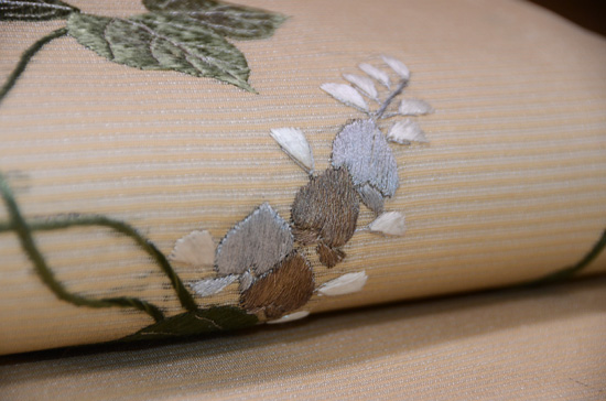 大きくぽってり刺された刺繍には、色漆がふんだんに使われていて、落ち着いた色合いの中に、雅な光を放っています。