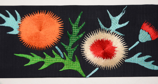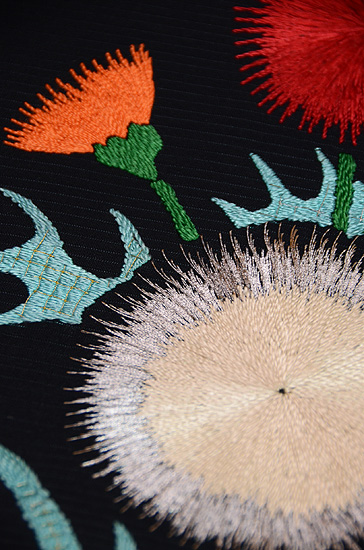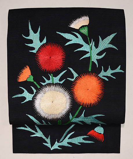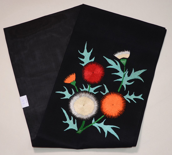黒地アザミの刺繍夏名古屋帯