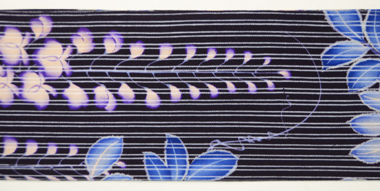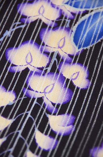 変わり絽縮緬の、双子縞が美しく浮き出た上に、大きな藤の房がはんなりと垂れ下がっています。