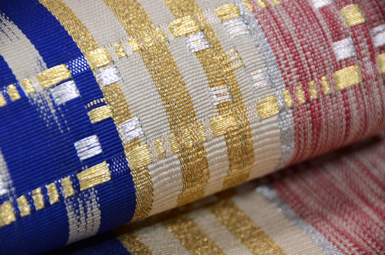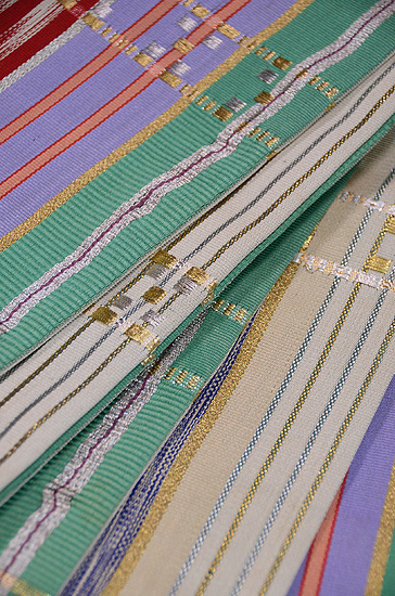 龍村を代表する名物裂の一つ、間道(縞)の帯。このシリーズは紬の着物に合わせることを意識して創作されたという言われていますが、シンプルなただの縞に収まりきらないところが龍村らしさの表れで、絣柄や金糸銀糸を織り込んだ豪華で多彩な間道となっています。