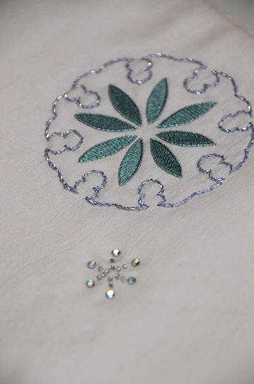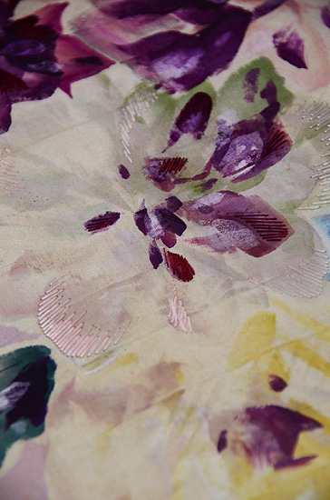 地もコラージュの柄も更紗模様で、上にビーズが施されています。