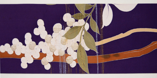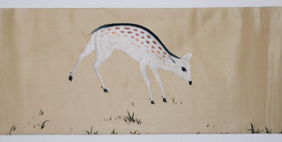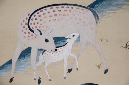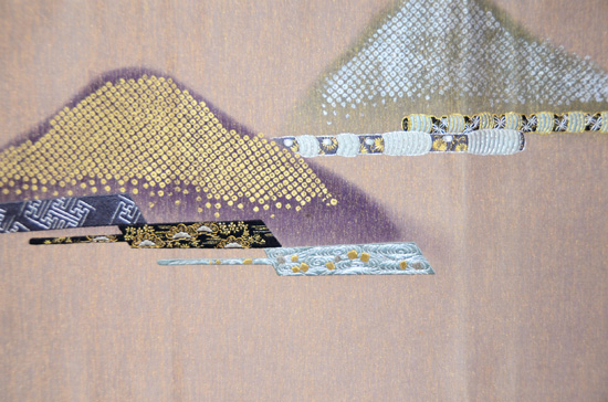 相良縫いと、細い金糸との刺繍が冴えて、趣ある景色になっています。