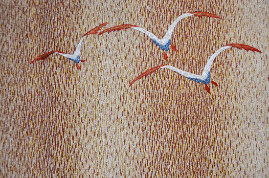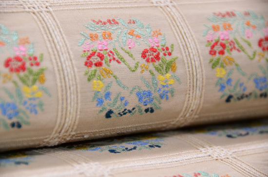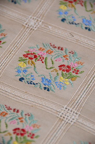 窓の縁に6本の紐が織り込まれ、浮き織りでお花が丸く織り込まれています。