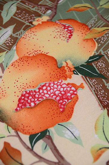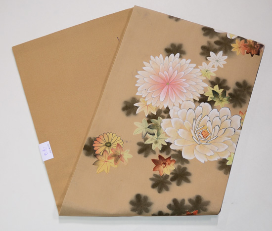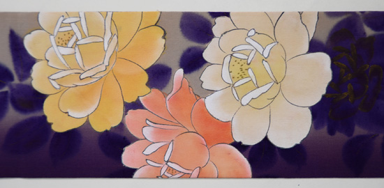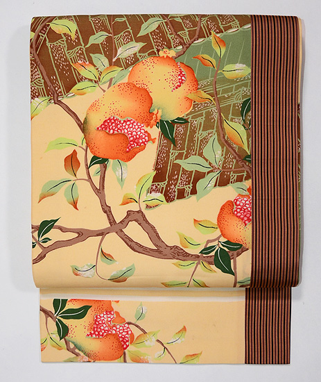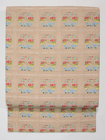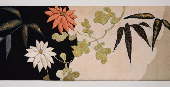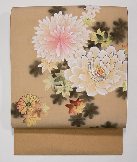 楓散らしの中に、菊とバラというかわいい取り合わせの名古屋帯です。