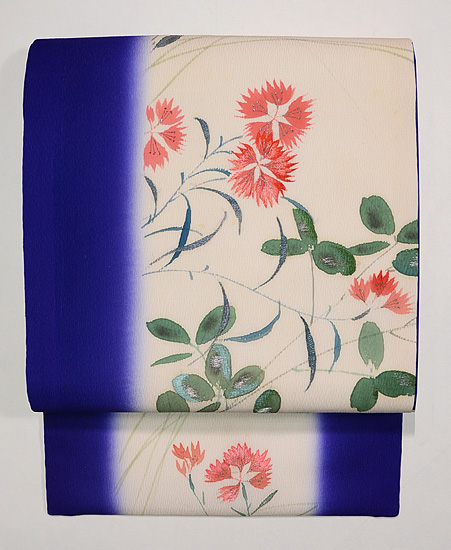 刺繍をあしらった珊瑚色なでしこの花、おみなえし黄色の彩り映える初秋の帯です。