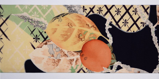 枯れた大きな葉と実る柿、ロウケツ風の枝。