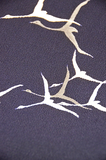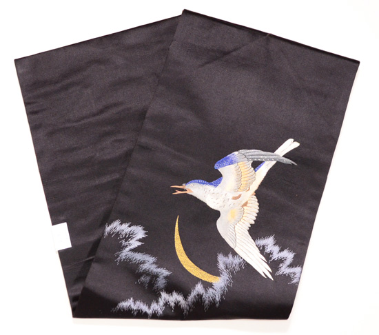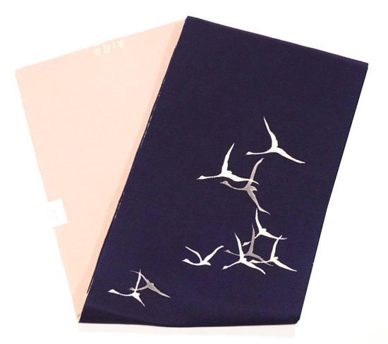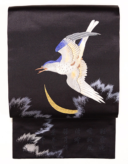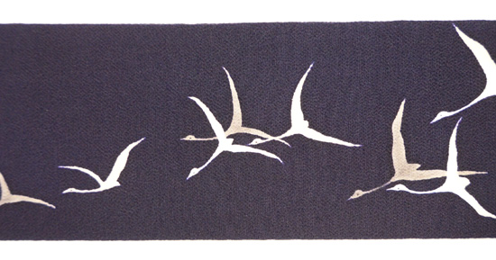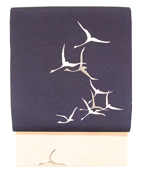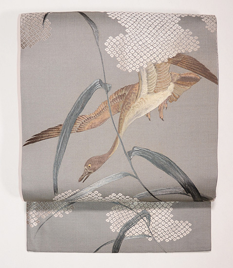疋田柄の雲文様が織りで表現されていて、雲間にハッと現れる大きな雁の写実的な姿が美しい帯です。