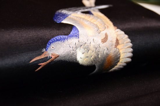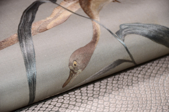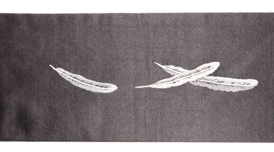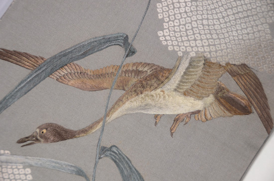 葉陰に魚影を追って、水面に降りてきた雁の勇姿が刺繍されています。