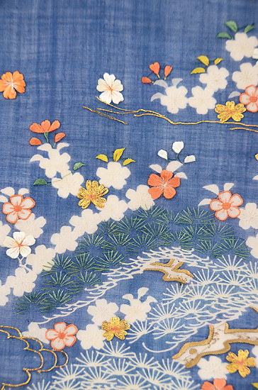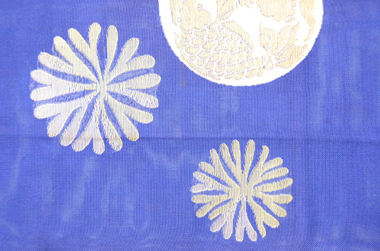 疋田絞りの代わりに線描と刺繍とで、雅な菊の文様を唐草風に描いています。