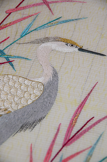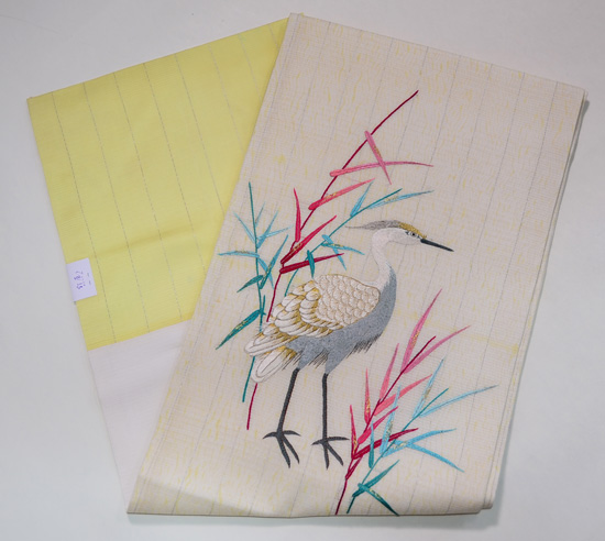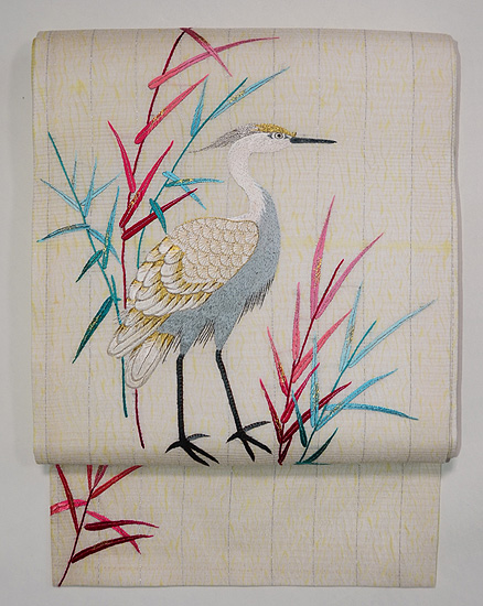 象牙色に輝く羽根が青空に映えて、神々しいまでに美しい帯です。
