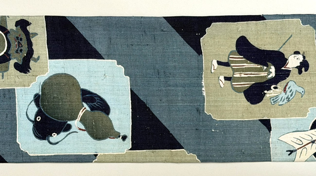 大津絵の代表的な絵柄を色紙に染め分けた面白楽しい帯です。