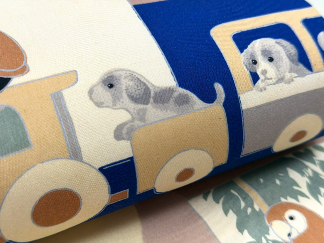 汽車の乗客は子犬、止まり木のオウム、アドバルーン、、、。大小の丸と四角が効果的に繰り返されたデザイン。