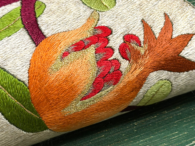 その中にはっとする色合の柘榴と八つ手が刺繍され、お太鼓を華やかに演出します。