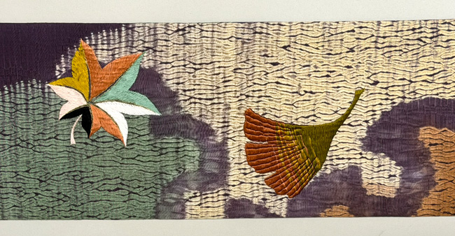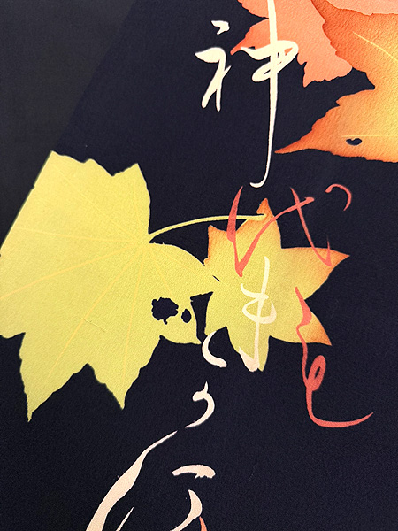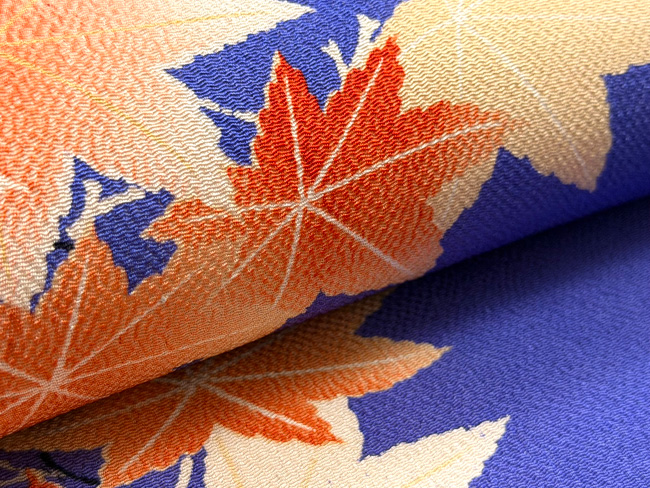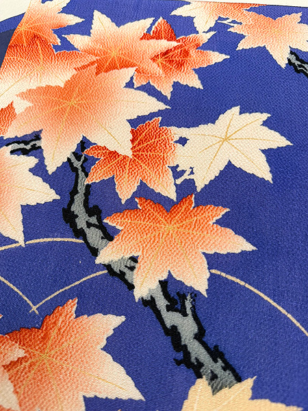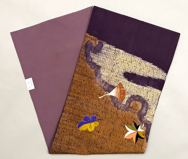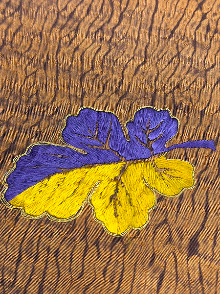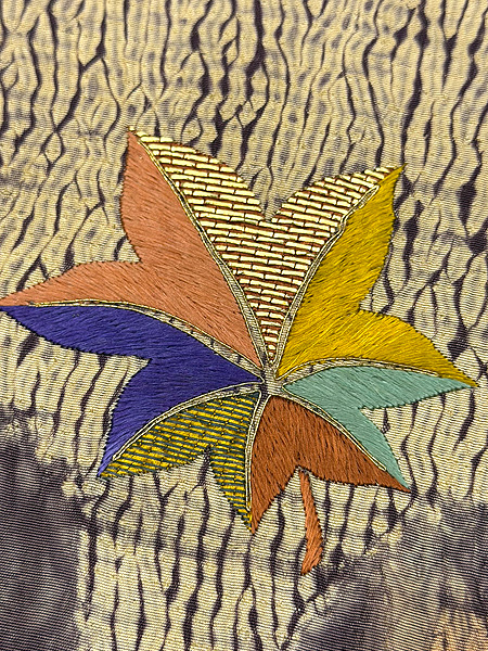大きく雪輪文様に杢目絞りされた地文。そこに、銀杏、楓、菊の葉が刺繍されています。
