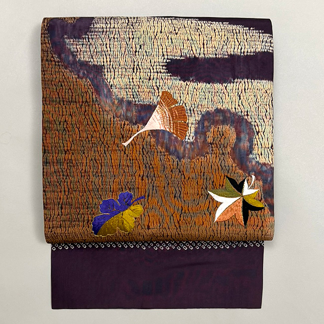 お太鼓にはときがら茶の雪輪文様の杢目絞りの上に楓、銀杏、菊の葉が現れます。