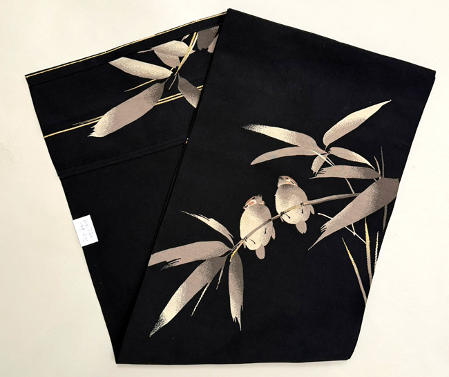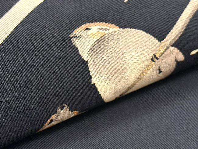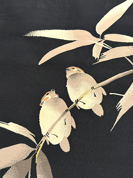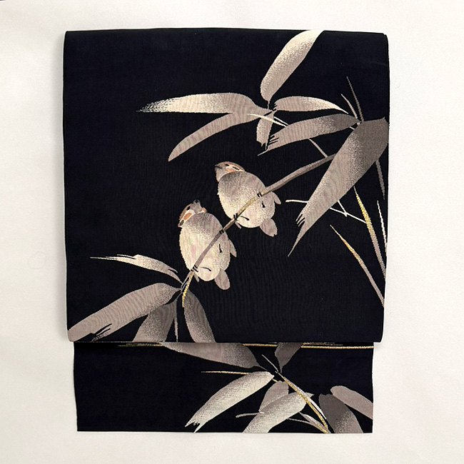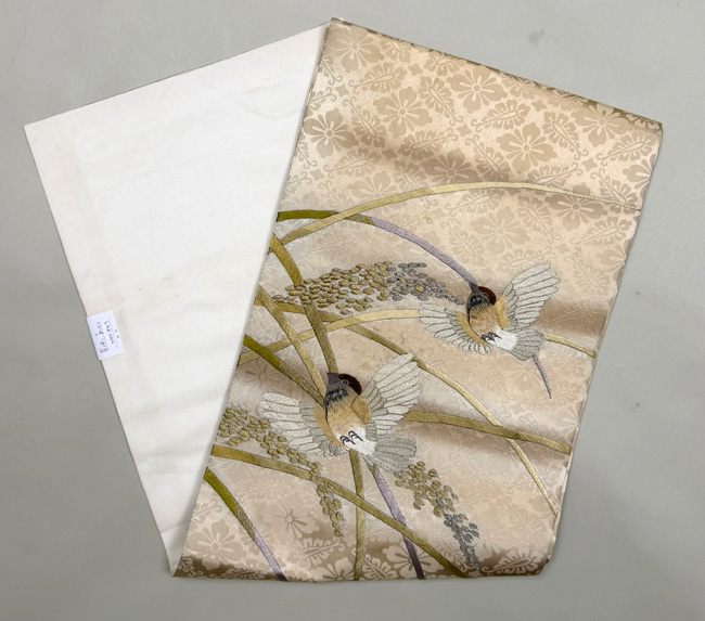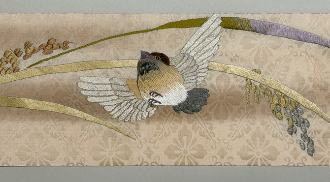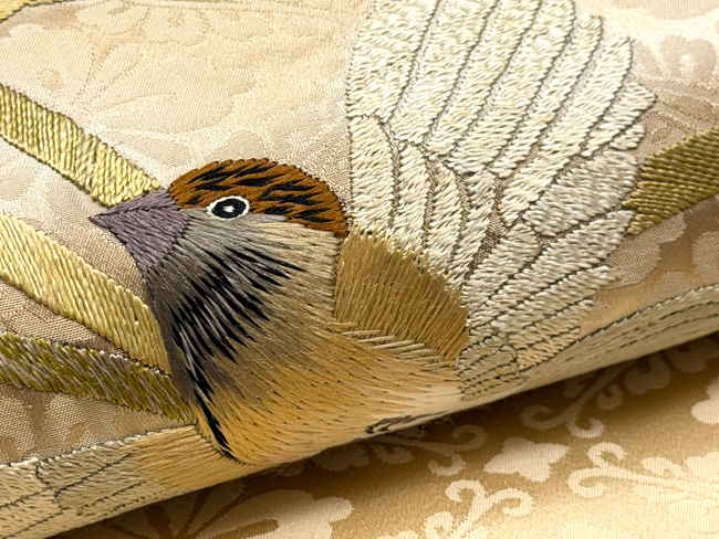 たわわに実る稲穂に迫る雀の様子が大胆に刺繍されたこちらの帯。