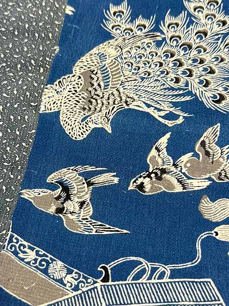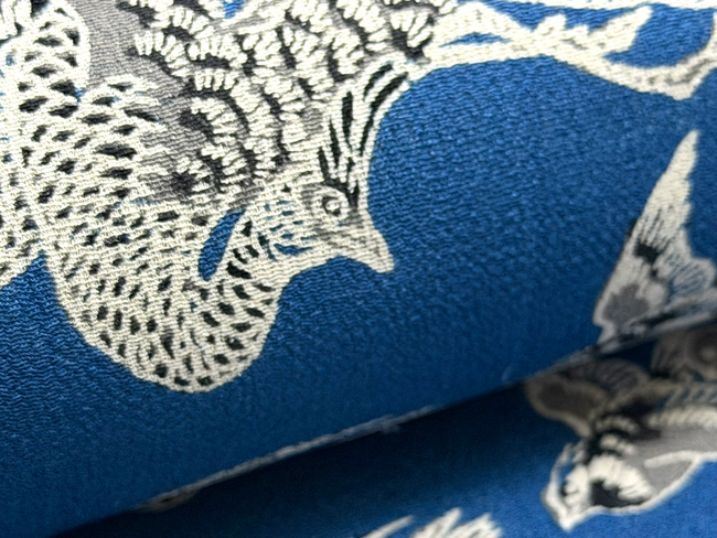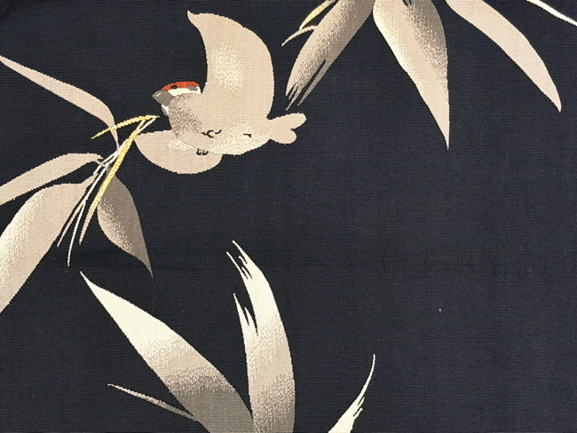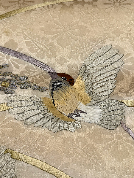 雀と稲穂はふっくらと刺繍され、浮き上がるような大きな花菱の地紋と相まってとても迫力あるデザインです。